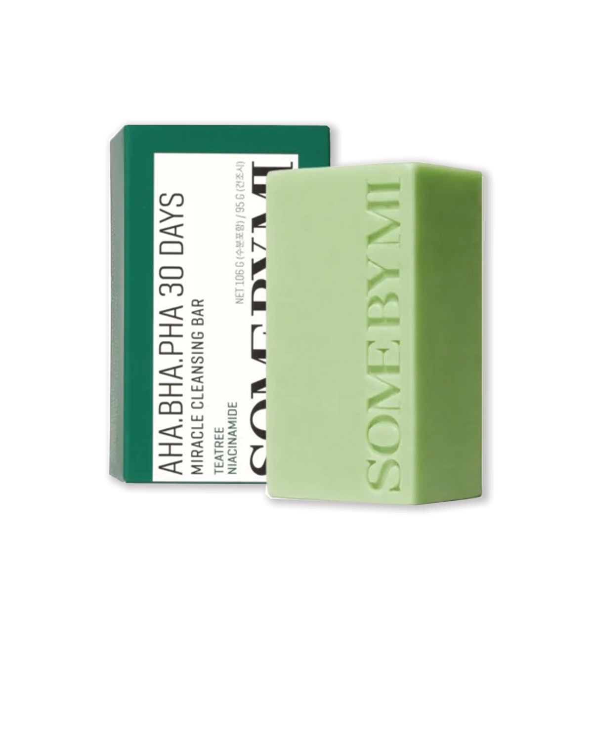 The Some By Mi AHA, BHA, PHA 30 Days Miracle Cleansing Bar is a **multi-functional soap** that deeply cleanses, gently exfoliates, and calms irritated skin. Infused with **AHA, BHA, and PHA**, this soap effectively removes dead skin cells, unclogs pores, and prevents breakouts. **Centella Asiatica and Tea Tree Extract** soothe inflammation while ensuring hydration is retained.