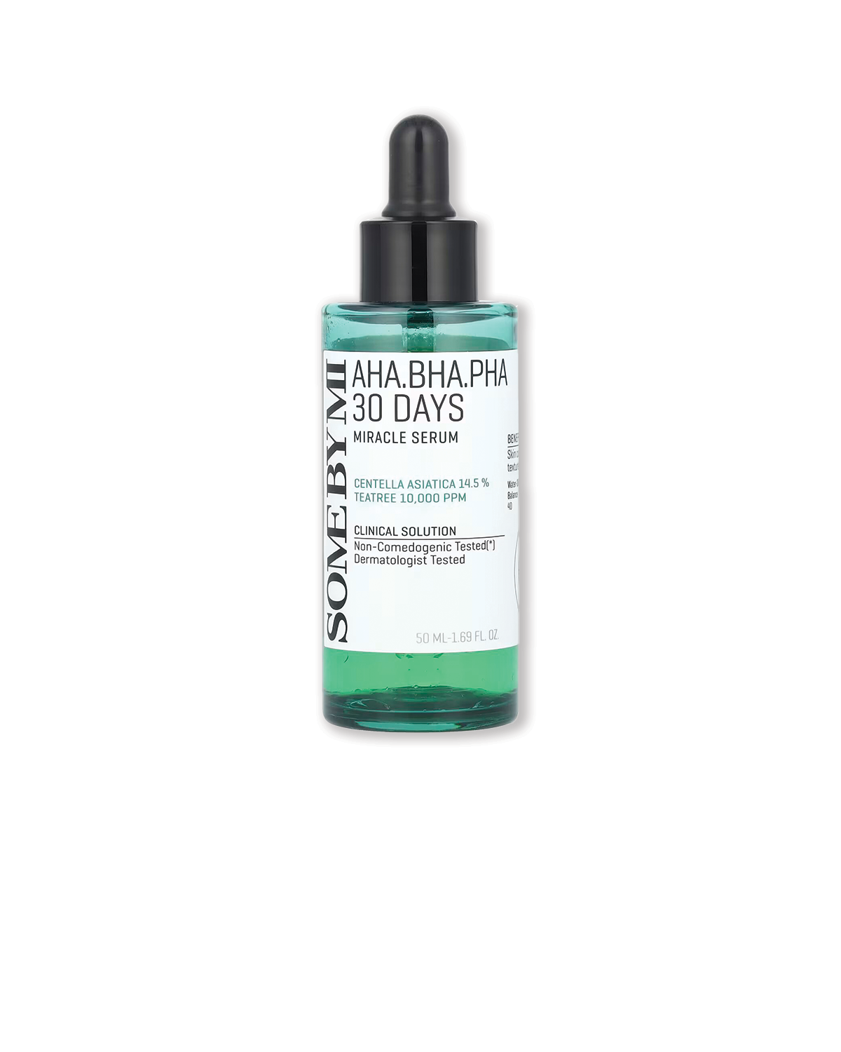 The Some By Mi AHA, BHA, PHA 30 Days Miracle Serum is a multi-functional skin treatment that exfoliates, hydrates, and soothes. Formulated with **Centella Asiatica, Niacinamide, and Tea Tree Extract**, this lightweight serum reduces acne, minimizes pores, and brightens the complexion. Ideal for acne-prone skin, it helps to regulate oil production and maintain a balanced moisture level.