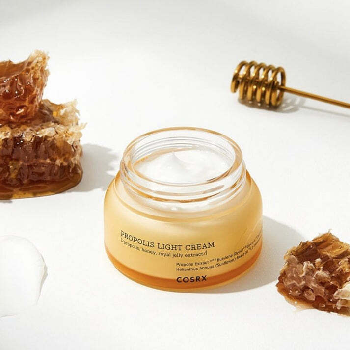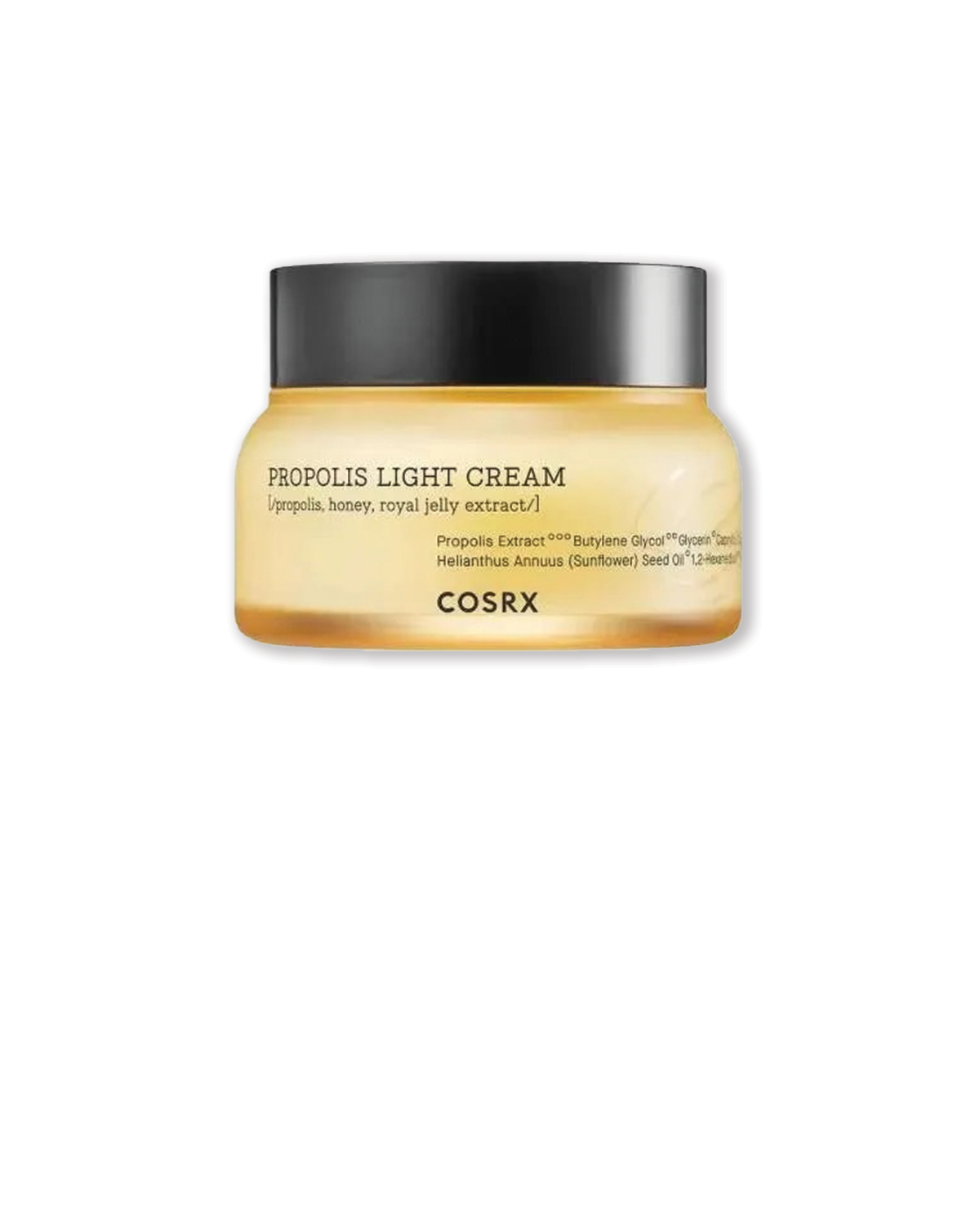 The COSRX Full Fit Propolis Light Cream is a deeply moisturizing cream formulated with **64.5% Black Bee Propolis Extract**, known for its anti-inflammatory and healing properties. It helps to soothe irritated skin, enhance skin elasticity, and provide long-lasting hydration. Its lightweight yet rich texture makes it perfect for all skin types, especially dry and sensitive skin.