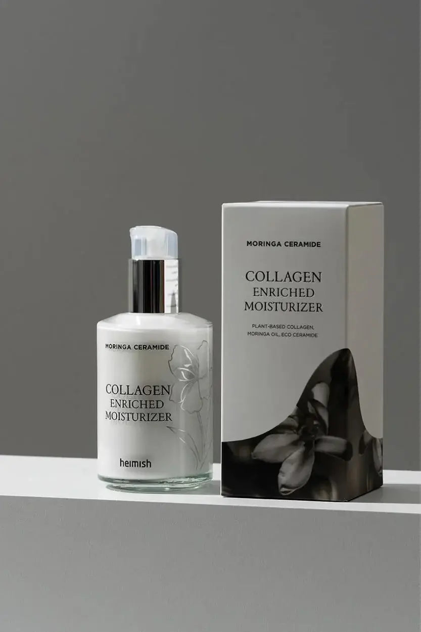 The Heimish Moringa Ceramide Collagen Enriched Moisturizer is a versatile skincare product that combines the benefits of plant-based collagen and moringa ceramide to provide deep nourishment and firming effects. Its lightweight, emulsion-type texture absorbs swiftly into the skin, delivering hydration without any sticky residue. This moisturizer helps strengthen the skin's elasticity and barrier, resulting in a smooth and radiant complexion. Suitable for all skin types, it can be used as an all-in-one moisturizer after toner application.